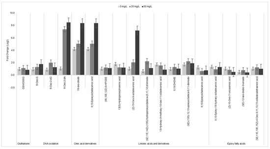 Fold change of the mutant 12023 HpxF- in comparison to parental strain 12023 at a PtNPs dose of 0 mg/L (light grey), 20 mg/L (grey) and 50 mg/L (dark grey). Overall cellular oxidation state was determined as the ratio between reduced (GSH) and oxidized (GSSG) Glutathione. DNA oxidation was determined by markers 8-oxo-G, 8-oxo-2-dG and 8-oxo-2-dA. Lipid peroxidation was assessed with markers for oleic acid, linoleic acid derivatives and epoxy fatty acids.