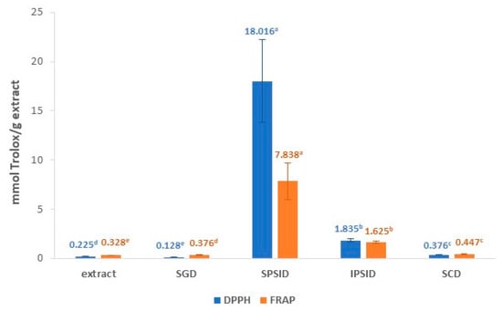 Antioxidant capacity of rosehip extract measured using the DPPH (2,2-diphenyl-1-picrylhydrazyl) and FRAP (Ferric Reducing Antioxidant Power) assays in different digestion stages. Values followed by different letters in the same color are significantly different at 95% confidence. (SGD = Simulated gastric digestion; SPSID = Soluble portion of intestinal digestion; IPSID = Insoluble Portion of Intestinal Digestion; SCD = Simulated Colonic Digestion).