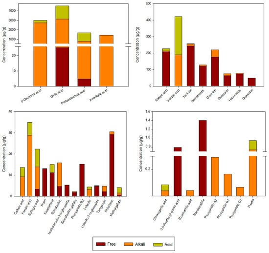 The effect of gastrointestinal digestion was dependent on the chemical class of the phenolic compounds. Regarding phenolic acids, the total free content decreased significantly (36%) during SGD but was enhanced after the intestinal phase, reaching a free phenolic acid content higher than that determined in the undigested extracts. However, the BI of phenolic acids was around 3% (Table 1). Phenolic acids in free form are very rarely present in plants, and the majority of phenolic acids, which are covalently bound to the matrix, are difficult to release during gastrointestinal digestion []. In the same way, Zhang et al. [] and Pérez-Jiménez et al. [] indicated that the phenolic compounds closely bound to the cell matrix, such as phenolic acids, are less affected by the neutral environmental pH and the enzymes acting in the small intestine.