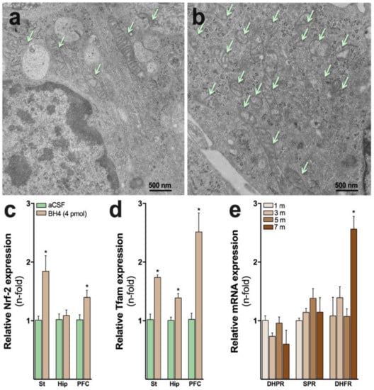 Tetrahydrobiopterin (BH4) pathway in the brain of naïve mice and the effect of its metabolites on mitochondrial parameters in sensory neurons. (a,b) Increased mitochondrial number in dorsal root ganglia neurons (sensory neurons) exposed to 50 nM neopterin for 24 h. (b) Arrows denote increased organelle number. Bars indicate 500 nm. Electron microscopy micrographs: 10,000× magnification. (c,d) Increased Nrf-2 and Tfam expression in different brain regions after 24 h of a single intracerebroventricular injection of 4 pmol BH4 (1 μL) in C57Bl6 mice. St: striatum; Hip: hippocampus; PFC: prefrontal cortex; aCSF: artificial cerebrospinal fluid. (e) Expression of the genes coding dihydropteridine reductase (DHPR; BH4 recycling pathway), dihydrofolate reductase (DHFR; BH4 salvage pathway), and sepiapterin reductase (SPR; BH4 de novo and salvage pathways) in the hippocampus of naïve C57Bl6 mice. 1, 3, 5, and 7 m: 1, 3, 5 or 7-month-old mice. * p < 0.05.