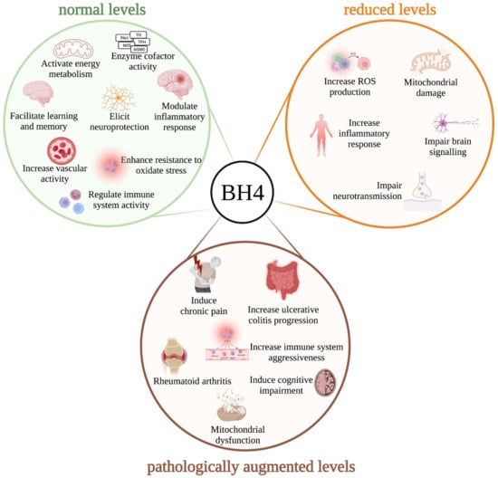 Considering that neopterin is a byproduct of the de novo BH4 pathway and that its levels reflect the magnitude of GTPCH activity, similar intracellular effects should be expected for BH4 under non-inflammatory conditions. Indeed, positive effects on the antioxidant system, mitochondrial physiology, and dynamics and cognition were observed in the brain and the immune system of animals with enhanced BH4 metabolism [18,83].
