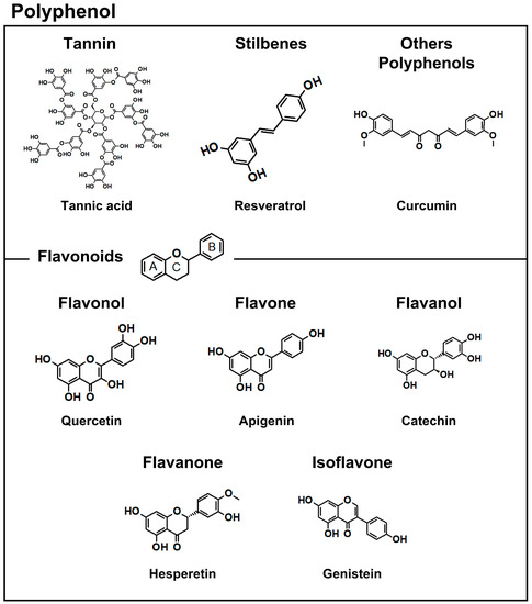 Recently, interest in the therapeutic application of polyphenols has increased, since these phytochemicals possess antioxidant, anti-inflammatory, anticancer, cardiovascular-protective, and anti-obesity properties [7,8]. They are found in many natural sources, such as woods, vegetables, fruits, seeds, and roots. Polyphenols generally contain an aromatic ring with one or more hydroxyl groups. According to the functional groups, polyphenols can be classified as phenolic acid, flavonoid, tannin, etc. (Figure 1) [9]. Various polyphenols are also being studied in combination with other anticancer drugs to enhance their effects.