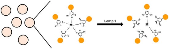 Polyphenols act as antioxidants by chelating metal ions with their hydroxyl groups. Recently, the interaction between polyphenols and metal ions has been exploited to remove toxic metal ions and form nanoparticles or coatings for drug delivery [86]. The metal–phenolic network (MPN) exhibits different affinities depending on the number of hydroxyl groups and the type of metal ion and has a pH-dependent property where the binding force is weaker at lower pH [87,88] (Figure 4). This feature is being used to develop anticancer drugs because it enables controlled release by targeting the acidic environment of cancer [89]. Chen et al. developed curcumin nanoparticles using MPN between EGCG and Fe(III) ions [90]. Curcumin nanoparticles dispersed by MPN exhibited a high curcumin EE of 90% and a size of 180 nm. MPN formation is pH-dependent; at low pH, the interaction with metal ions is weakened and nanoparticles are disassembled due to the protonation of polyphenols. This phenomenon was confirmed by in vitro studies showing that the amount of curcumin released was 90% at pH 5 and 34% at pH 7.4. Thus, once inside the cancer cells, curcumin can be rapidly released within the endosome or lysosome due to its low pH. Curcumin nanoparticles exhibited significantly higher cytotoxicity against MCF-7 cancer cells, which was associated with Bcl-2 down-regulation and Bax and caspase 3 up-regulation-induced apoptosis. In addition, these nanoparticles inhibited the migration and invasion of cancer cells more effectively than free curcumin in vitro. These particles did not induce hemolysis and blood toxicity, and compared to free drug, tumor growth was inhibited nearly two-fold when treated with curcumin nanoparticles in mice bearing MCF-7 xenografts.