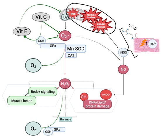 RONS production and cellular fate. The mitochondrial function produces superoxide anion O2·−, which is transformed into H2O2 due to the antioxidant enzymes Mn-SOD, CAT and GPx. Muscular damage, oxidation of L-arginine (L-Arg) and increased calcium level (↑) activates iNOS and the production of NO. An overproduction of H2O2 or the action of O2·− with NO will induce OS through OH− and ONOO−, respectively, resulting in DNA, lipid and protein damage. Contrarily, a controlled H2O2 level will be in favor of muscle health. Non-enzymatic antioxidants such as vitamins C and E inhibit the production of O2·−, and thus also limit the oxidant stress. Created using Biorender.com (accessed on 28 April 2023).