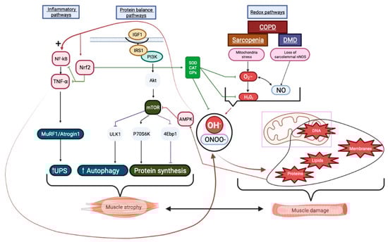 The roles of RONSs during skeletal muscle pathologies. Redox pathways in COPD, DMD and sarcopenia, mitochondria dysfunction and sarcomere NO leakage produce OS, which causes muscle damage leading to muscle atrophy. Protein balance pathways: the IGF1/PI3K/Akt/mTOR protein synthesis pathway is impacted by OS. Mitochondrial dysfunction due to the RONS active, AMPK, inhibiting mTOR and leading to rapid atrophy. Inflammatory pathways: inflammation is increased by OS via (+) NF-κB and TNF-α, activating UPS and resulting in muscle atrophy. In addition, OS triggers the release of antioxidant enzymes via Nrf2; however, SOD, CAT and GPx are insufficient to compensate for the overproduction of OH− and ONOO−. According to the roles played by RONSs and their consequences, the described pathologies support OS-induced muscle atrophy and damage. Created using Biorender.com (accessed on 28 April 2023).