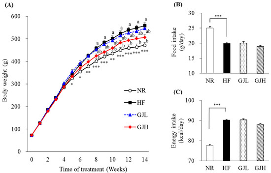 3.1. Effects of GJ on Body Weight Gain and Energy Intake