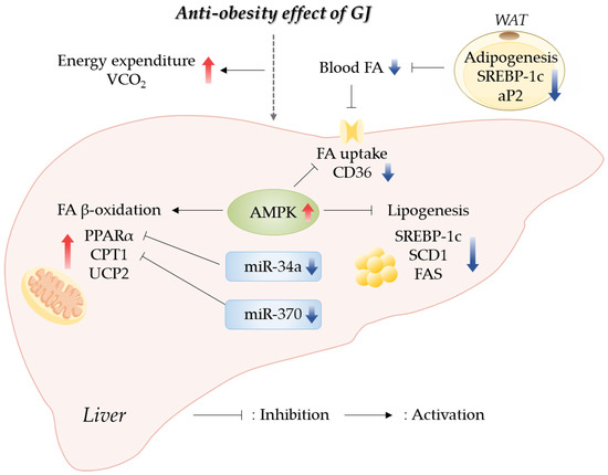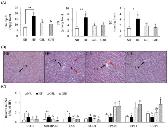 3.5. Effects of GJ on Lipid Accumulation and Gene Expression Related to Lipid Metabolism in the Liver