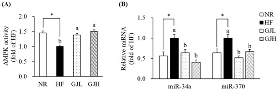 3.6. Effects of GJ on AMPK Activity and miR-34a/370 Expression