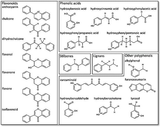 Distinct substructure of polyphenols. Figure reused under the permission granted by http://creativecommons.org/licenses/by/4.0/ (accessed on 27 April 2023) [10].