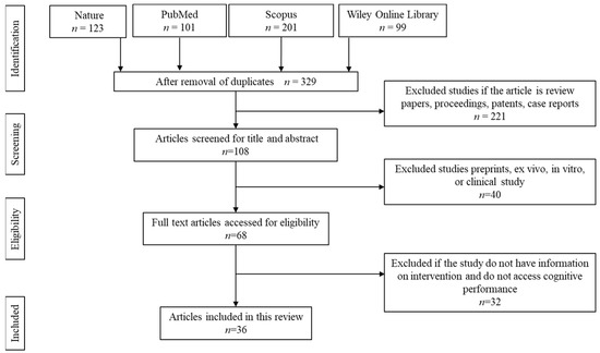 The article selection and screening processes were conducted as shown in Figure 2. The initial screening resulted in a total of 524 articles. About 195 articles were removed owing to duplication. Of the remaining 329 articles, 221 articles were removed due to being secondary literature, case reports, proceedings, and patents. Another 40 articles were removed because the articles focused on in vitro, ex vivo, retrospective, or prospective studies. The remaining 68 articles were screened and accessed for full-text eligibility. From there, 32 articles were removed because the articles did not specify the details on the dose, duration, and type of intervention or if the study did not assess cognitive performance.