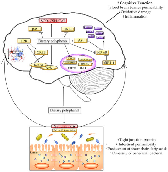Polyphenols play a vital role in restoring cognition via the signaling pathway involving the gut-brain axis. This is because polyphenols must undergo biotransformation to obtain their metabolites, and this process is accommodated by the gut microbiome. Hence, the gut–brain axis acts as a neuroendocrine system that helps the polyphenols’ metabolites to cross the BBB and exhibit their effects. This may be achieved by various networks involving the enteric nervous system or neuroimmune system [57]. Disruption in the gut–brain axis homeostasis is one cause of cognitive decline [138]. A recent study shows that gut in dysbiosis, a particularly significant reduction in Eubacterium rectale—an anti-inflammatory bacterium—with an increased level of Escherichia coli and Shigella—proinflammatory bacteria—is one of the primary reasons for peripheral inflammation and cognitive decline. This hypothesis was further proven by the presence of abnormal deposition of amyloid in the brain (amyloidosis) [139]. Another study indicates that chronic infection of Helicobacter pylori is significantly linked to increased gastric atrophy and cognitive dysfunction. The study proves that Helicobacter pylori-infected Alzheimer’s is more susceptible to developing neuroinflammation and cerebrovascular lesions, leading to cognitive impairments [140]. Similarly, excessive level of Escherichia coli in the gut microbiota stimulates microgliosis and activates TNF-α, IL-12, and IL-6, eventually resulting in cognitive impairments [141]. In due course, the short-chain fatty acids from microbes mediate the interaction between the bacteria and the microglia cells. When this happens, the bacterial metabolites tend to deviate from colonic mucosa blood circulation, crossing the BBB and inducing neuroinflammation in the brain [142].