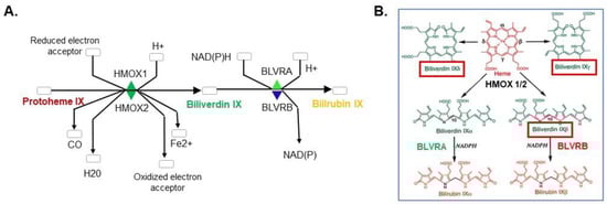 Heme degradation pathway schema. (A) Canonical pathway [Heme → Biliverdin (BV) → Bilirubin (BR)] with cofactor/product generation. (B) Heme-generated BV isomers highlight BLVRB substrates (BV IXβ, BV IXδ, BV IXγ, red boxes) that are distinct from those utilized by BLVRA (BV IXα); isomer-restricted bilirubins (BR IXα and BR IXβ) are shown.