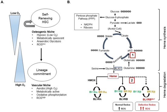 BLVRB mechanism(s) during hematopoiesis. (A) Metabolic differences between self-renewing and lineage-committed stem cells highlight adaptive differences in oxygen tension, glucose utilization, and ROS accumulation as cells transition from the normally hypoxic osteogenic niche to the oxygen-enriched vascular niche concomitant with lineage commitment. (B) The schema outlines critical BLVRB-associated pathways (PPP, TCA, glycolytic) that intersect with heme. Heme generation and degradation function as a linear pathway that uses glucose and glutamine carbon pools for TCA anaplerotic functions required for heme synthesis, functionally linked to downstream bilirubin (antioxidant) generation regulated by BLVRB and BLVRA (heme degradation). The parallel glucose-dependent pentose phosphate pathway provides both the NADPH reducing equivalents and riboses required for purine and pyrimidine synthesis. The rate-limiting ALAS (aminolevulinic acid synthase) reaction controls heme biosynthesis by condensation of TCA-derived succinyl CoA and glycine. Based on current models, BLVRB-associated functions in hematopoiesis have been identified in TCA glutamine uptake [1] or ROS handling [2] (highlighted by red boxes). Defective glutamine utilization would lead to attenuated heme generation, while defective or deficient BLVRB redox function (red) would result in ROS accumulation (red) as a stage-specific signal for post-commitment lineage expansion (megakaryocytopoiesis; see text for details); presence of a putative BV/BR redox cycle modeled on BV IXα/BR IXα is shown []. The TCA carbon atom transition map for key intermediates is delineated by gray circles.