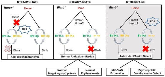 Blvr−/− mice display phenotypic features that mirror the hematopoietic defect(s) previously described in human [] and murine [] Hmox1 deficiency. These observations emphasize the critical role of an intact heme degradation pathway in both basal and stress hematopoiesis. Heme-containing proteins are present in the majority of eukaryotic cells and tissues, although erythrocyte heme encompasses ~80% of the organismal heme in mammals. Heme preponderance in erythrocytes presumably accounts for the hematopoiesis-restricted phenotype(s) demonstrable in murine models of heme degradation pathway deficiency [,,]. The rarity of HMOX1 deficiency in humans limits firm genotype/phenotype conclusions []. In contrast, the phenotypic characterization of murine Hmox1−/− mice demonstrates defective iron utilization, with the development of age-dependent anemia and progressive splenic fibrosis []. The presence of acquired and selective macrophage loss in murine Hmox1−/− deficiency is also evident, and supported by phenotypic rescue of the hematopoietic defect using macrophage-restricted bone marrow transplantation [,]. No comparable defects in iron utilization or macrophage loss are demonstrable in Blvrb−/− mice. While the phenotype of Hmox1−-deficient mice is well-established, additional information has been obtained using heterozygous Hmox-deficient models. Haploinsufficient Hmox1+/− mice display a progressively restricted phenotype that is manifest by a disrupted response to acute stress in stem cells and progenitors [], with evidence for defective stress erythropoiesis in 5-FU-treated mice []. This stress phenotype is similar to that evident in Blvrb−/− mice, although megakaryocytopoietic effects were not described in Hmox1+/− mice []. The hematopoietic effects of Hmox- or Blvrb-deficient mice are summarized in Figure 3.