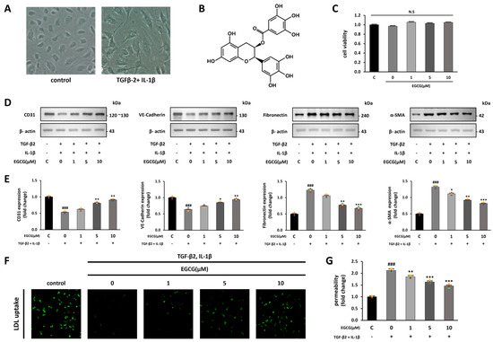 Co-treatment with TGF-β2 and IL-1β produces synergistic effects on EndMT induction [28]. We confirmed the possibility that EGCG treatment contributes to the inhibition of fibrosis by inhibiting EndMT from the co-stimulation of TGF-β2 and IL-1β. First, we observed changes in cell morphology when EndMT was induced by co-stimulation with TGF-β2 and IL-1β in HUVECs. While the control group had a cobblestone-like shape, the TGF-β2 and IL-1β co-stimulated group was spindle-shaped, similar to mesenchymal cells (Figure 1A). We then confirmed whether EGCG treatment affects cell viability; however, no significant effect was observed (Figure 1C). HUVECs were treated with EGCG (0, 1, 5, and 10 μM) for 24 h, and simultaneously co-stimulated with TGF-β2 and IL-1β for 5 days. After this, the expression levels of endothelial and mesenchymal cell markers in the cells were measured using Western blotting to confirm the effect of EGCG on the induction of EndMT [29]. As a result, CD31 and VE-cadherin (endothelial cell markers) were significantly decreased, and fibronectin and α-SMA (mesenchymal cell markers) were significantly increased in the TGF-β2 and IL-1β co-stimulated group compared with the control group; however, their expression levels were significantly reversed by EGCG treatment (Figure 1D,E). Additionally, LDL uptake and FITC-dextran permeability assays were conducted to confirm whether the properties of endothelial cells were maintained in TGF-β2 and IL-1β co-stimulated HUVECs treated with EGCG. Compared to the control group, LDL uptake was decreased in the TGF-β2 and IL-1β co-stimulated group, and this was significantly recovered in the EGCG-treated group (Figure 1F). Moreover, compared with the control group, dextran permeability on the monolayer of HUVECs in the TGF-β2 and IL-1β co-stimulated group was increased and significantly recovered in the EGCG-treated group (Figure 1G). These results indicate that treatment of HUVECs with EGCG can inhibit EndMT induced by TGF-β2 and IL-1β co-stimulation, thereby maintaining endothelial cell properties.
