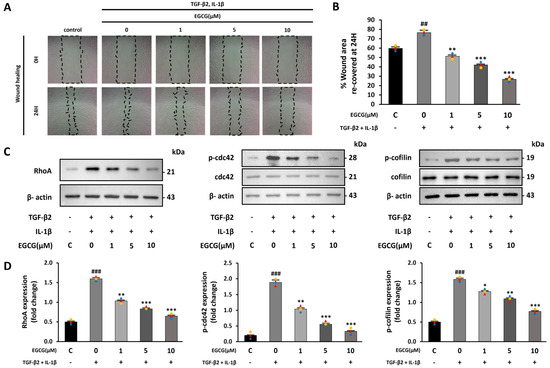 EGCG-induced inhibition of cell migration ability caused by TGF-β2 and IL-1β treatment. (A) Microscope images of scratched area observed at 0 h and 24 h after making scratch (10× magnification) and (B) percentage of recovered area after 24 h. (C,D) Effect of EGCG on the expression level of RhoA and phosphorylation level of CDC42 and cofilin in HUVECs co-stimulated with TGF-β2 and IL-1β compared with control group. ## p < 0.01, ### p < 0.001 vs. HUVECs without EGCG and TGF-β2 and IL-1β treatment; * p < 0.05, ** p < 0.01, *** p < 0.001 vs. TGF-β2- and IL-1β-induced HUVECs without EGCG treatment. Data were fold-changed for control group (n = 3).