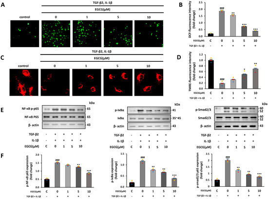 Antioxidant and anti-inflammatory effects of EGCG. (A) Fluorescence microscopy image of intracellular ROS produced after TGF-β2 and IL-1β co-stimulation with or without EGCG treatment (40× magnification). (B) ROS quantitative analysis. (C) Mitochondrial membrane potential measured via TMRE assay (200× magnification). (D) TMRE fluorescence intensity. (E,F) Effect of EGCG on phosphorylation level of NF-κB, IκBα, and SMAD2/3 in TGF-β2 and IL-1β co-stimulated HUVECs compared with control group. ### p < 0.001 vs. HUVECs without EGCG and TGF-β2 and IL-1β treatment; * p < 0.05, ** p < 0.01, *** p < 0.001 vs. TGF-β2- and IL-1β-induced HUVECs without EGCG treatment. Data were fold-changed for control group (n = 3).