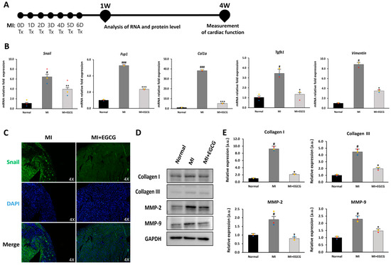 Regulation of EndMT in EGCG-treated MI model. (A) Timeline of the animal study. (B) Changes in EndMT and EndMT-related gene expression (Col1a, Fsp1, Snail, Tgfb, and vimentin) according to real-time PCR (n = 3). (C) Snail expression according to immunofluorescence [green: Snail (EndMT marker), blue: DAPI] (10× magnification). High-quality version: Supplementary Figure S1. (D,E) Immunoblot analysis of collagen I, collagen III, MMP-2, and MMP-9 with GAPDH as control (n = 3). # p < 0.05 and ### p < 0.001 vs. Normal; * p < 0.05, ** p < 0.01 and *** p < 0.001 vs. MI. Data are expressed as X-fold induction compared to normal control. All values are mean ± standard deviation. Statistical significance was assessed by one-way ANOVA.