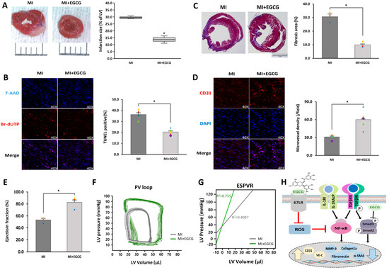 Cardioprotective effects of EGCG on heart tissue after ischemia. (A) Infarct size according to TTC staining. Infarct size (%) was calculated as the ratio of the infarcted area (pale) to the risk area (deep-red). Distance between bars = 0.1 cm. p = 0.0007 (n = 3). (B) Apoptotic cell death according to TUNEL assay (TUNEL-positive cells, pink; 7-AAD, blue) performed 1 week after MI (40× magnification). * p = 0.0004 (MI: n = 3; MI + EGCG: n = 4). High-quality version: Supplementary Figure S2. (C) Fibrotic tissue area measured using Masson’s trichrome of cardiac sections 1 week after establishing MI (collagen fibers, light blue; muscle fibers, red). Bar = 2 mm; p = 0.0013 (n = 3). (D) Capillary density according to immunofluorescence staining for CD31 1 week after MI (CD31-positive microvessels, red; DAPI, blue) (40× magnification). * p = 0.0035 (n = 5). High-quality version: Supplementary Figure S3. (E) Ejection fraction (n = 3). (F) Representative pressure–volume loop. (G) End-systolic pressure–volume relationship (ESPVR). (H) A schematic summary of the regulation of EndMT by treating EGCG in ischemic hearts. * p < 0.05 vs. MI group. Data are expressed as X-fold induction compared to normal control. All values represent mean ± standard deviation. Statistical significance was assessed by one-way ANOVA.