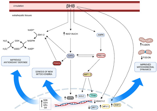 The main pathways involved in the multiple effects of KD on mitochondrial health. The blue arrows suggest the main effects driven by βHB-influenced factors (i.e., improved antioxidant defense, genesis of new mitochondria, and improved mitochondrial dynamics). AMPK, AMP-activated protein kinase; BNIP3, Bcl-2 interacting protein 3; DRP, dynamin related protein 1; GCLC, glutamate cysteine ligase catalytic subunit; GPx, glutathione peroxidase; GR, glutathione reductase; HDAC1-2, histone deacetylases 1-2; IDH1-2, isocitrate dehydrogenase 1-2; MFN2, mitofusin 2; NAD, nicotinamide adenine dinucleotide; NADP, nicotinamide adenine dinucleotide phosphate; NRF1-2, nuclear respiratory factors 1-2; PGC1-α, peroxisome proliferator-activated receptor γ coactivator 1α; SIRTs, sirtuins; SOD, superoxide dismutase; TFAM, mitochondrial transcription factor A; UCPs, mitochondrial uncoupling proteins. Created with BioRender.com, accessed on 25 April 2023.