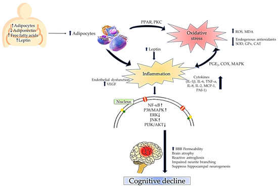 Oxidative stress and inflammation in obesity are closely associated with cognitive decline. For instance, high leptin concentration in the serum stimulates adipose tissue to release proinflammatory factors, such as IL-1, IL-6, and TNF, which may further promote the adipocytes to release more and more leptin [71]. IL-1 modulates hippocampal-dependent memory in the brain. The overexpression of IL-1 could induce microglial cells to exhibit inflammation by triggering morphological changes in the microglial cells via a process known as inflammatory microgliosis. Increased infiltration of the microglial facilitates neuroinflammation in the brain. In the dental gyrus, IL-1 plays a vital role in LTP, and excessive levels of IL-1 may block the regulatory action of IL-1 in learning and memory, causing memory decline. The expression of IL-1 in the hippocampus will inhibit the normal neurogenesis mechanism, leading to neuronal apoptosis, which may evince a depressive-like behavior [72]. Meanwhile, the excessive release of IL-6 will increase the formation of the vascular endothelial growth factor (VEGF). In such conditions, the VEGF enhances the release of nitric oxide synthase in the endothelial, which may suppress occludin, a tight junction protein present in the blood–brain barrier (BBB). A low concentration of occludin may cause the BBB to be more permeable [73], causing the upregulation of BACE1 enzymes in the brain. BACE1, in turn, may activate several underlying mediators that result in neuronal apoptosis and memory impairments [74]. Along with this, TNF-α is associated with hippocampal-dependent memory in the brain. TNF-α is also known for its neuromodulating activity in the brain, specifically by activating astrocytes and microglial activity. In this context, TNF-α impairs contextual fear memory by inhibiting the transmission of excitatory synaptic in the astrocytes. Simultaneously, TNF-α may inhibit LTP, a synaptic interaction between hippocampal neurons, which is responsible for learning and memory in the brain [75].