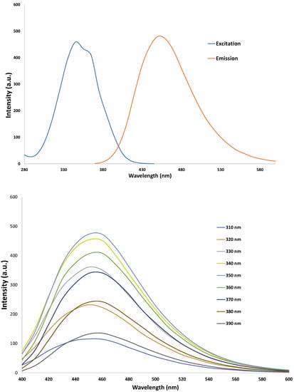 Characterization of carbon nanodots. (Top) panel: absorption spectrum. The emission peak is at 460 nm, with an excitation wavelength of 360 nm. (Bottom) panel: carbon nanodots show an emission peak of ≈460 nm with excitation wavelengths from 220 to 400 nm.