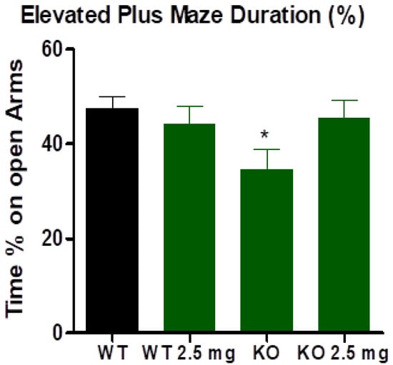 LDLr knockout (KO) mice have significantly higher anxiety than C57BL6/J (WT) mice (p = 0.025) as indicated by asterisk (*). In rodents, the less time spent in an open arm, the higher the anxiety.