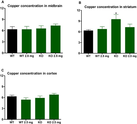 In both the midbrain and striatum, iron concentrations were significantly elevated in the LDLr knockout (KO) mice compared to the C57BL6/J (WT) mice but were normalized with carbon nanodots treatment (p < 0.05) (Figure 3A,B). The striatum was the only brain region where an elevation in copper concentrations was observed in the LDLr knockout mice compared to the C57BL6/J mice (p < 0.05). This significant elevation in striatal copper concentrations was normalized with carbon nanodot treatment (Figure 4B). Carbon nanodot treatment had no effect on iron or copper levels in the C57 BL/6J (WT) mice’s brains (Figure 3 and Figure 4).
