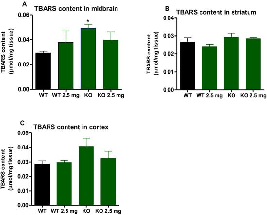 Malonaldehyde levels are expressed as TBARS mean ± standard error in the midbrain (A), striatum (B), and cortex (C) of C57BL6/J (WT) mice and LDLr knockout (KO) mice treated with 0 or 2.5 mg CND for 16 weeks. LDLr knockout mice showed significantly elevated TBARS in the midbrain, as indicated by the asterisk (*) (p < 0.05). This significant elevation was normalized with the carbon nanodot treatment.