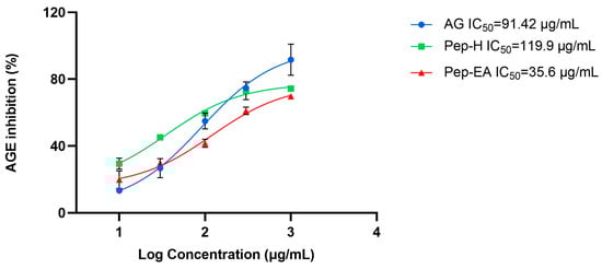 The BSA-AGE fluorescence assay was used to assess the in vitro anti-glycation potential of varying concentrations of Pep-H and Pep-EA. After two weeks of incubation with the BSA-glucose buffer, the extent of glycation inhibition was calculated. Pep-EA potentially inhibited the glycation with an IC50 value of 35.6 μg/mL, much lower than Aminoguanidine, the positive control (IC50 91.42 μg/mL). In a previous report, a similar IC50 value of 91.2 μg/mL was reported for Aminoguanidine []. Pep-H also exhibited similar anti-glycation activity (IC50 119.9 μg/mL) as the control (Figure 2). Previously, black pepper (hydro-alcoholic) extracts inhibited AGE formation by 67% in the BSA-glucose model [].
