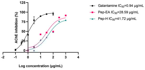 To evaluate the neuroprotective effect of black pepper extracts, we also studied their anti-acetylcholine esterase (AChE; E.C.3.1.1.7) activity. The higher AChE induces apoptosis and affects synaptic integrity neurodevelopment [] therefore AChE inhibition is desirable in the management of AD to maintain the level of the neurotransmitter acetylcholine (ACh) for cholinergic transmission. In this study, the pepper extracts displayed ~40% inhibition in preliminary screening at 100 μg/mL. Hence, the experiment to calculate IC50 values (half maximal inhibitory concentration) was conducted. The IC50 value of Pep-H was 41.72 μg/mL and that of Pep-EA was 28.59 μg/mL. In previous studies, the methanolic pepper extract had shown an IC50 value of 11.13 μg/mL [] whereas the black pepper oil exhibited a strong AChE inhibition with a low IC50 value (5.9 μg/mL) []. The IC50 value of the positive control, Galantamine, was calculated as 0.94 μg/mL, like the previously reported value of 1.45 μg/mL []. The IC50 values of the extracts and the positive control have been shown in Figure 3.