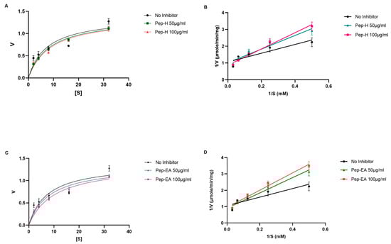 Similar Vmax (the maximum rate at which an enzyme is catalyzed when the enzyme is saturated by the substrate) values were obtained for the no-inhibitor (1.375 μmole/min/mg) with Pep-H (1.364 μmole/min/mg at 50 μg/mL and 1.372 μmole/min/mg 100 μg/mL) and Pep-EA (1.333 μmole/min/mg at 50 μg/mL and 1.360 μmole/min/mg 100 μg/mL), while an increase in the Km (the concentration of substrate which permits the enzyme to achieve half Vmax) values was observed: 7.37 mM (no-inhibitor), Pep-H (8.35 mM; 8.75 mM), and Pep-EA (8.05 mM;10.08 mM) at 50 μg/mL and 100 μg/mL, respectively (Figure 4). The increased Km value in the presence of an inhibitor reduces the affinity of the enzyme for the substrate. These results indicate a competitive inhibition pattern where the inhibitor competes with the substrate for binding to the active site of the enzyme.