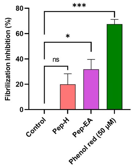 Aβ fibrilization inhibition activity of the pepper extracts was assessed using a ThT assay. The fluorescence signal is increased upon binding of ThT to the amyloid β-sheet. The extracts were screened at 100 μg/mL for Aβ fibrilization inhibition with Phenol red as a positive control. A statistically significant reduction was seen in the extracts compared to the control (buffer + Aβ). Phenol red exhibited a 67.49 ± 3.73% inhibition (*** p < 0.001) at 50 μM, comparable to the previously described value []. Pep-H was statistically non-significant while Pep-EA exerted statistically significant (* p < 0.05) inhibition of 31.84 ± 7.76% compared to the control (Figure 5).