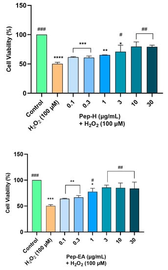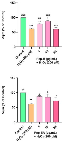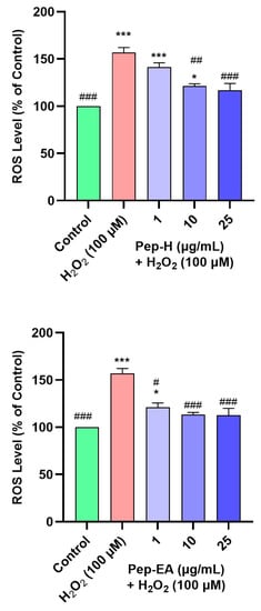 Both the extracts displayed dose-dependent neuroprotection with a statistically significant effect at higher concentrations. Pep-EA performed better in protecting the cells against oxidative damage and significantly (# p < 0.05) increased the cell viability at 1 μg/mL and ## p < 0.01 at 3–30 μg/mL compared to H2O2 control. Pep-H significantly increased the cell viability at 3 μg/mL (# p < 0.05) and at 10 and 30 μg/mL (## p < 0.01) as compared to the H2O2 control. However, the lower concentrations (0.1–1 μg/mL) were ineffective for Pep-H (Figure 7). From the results, it can be concluded that 10 μg/mL of both extracts is the best concentration to display maximum neuroprotection, after which the effect remains almost constant. The neuroprotective mechanism was further explored by measuring the ROS and the MMP.