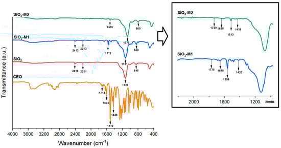The Fourier transform infrared spectrum provides the necessary information to identify functional groups. With the above in mind, pure and modified SiO2 nanoparticles (M1 and M2) were analyzed to verify that the main compound (cinnamaldehyde, 81.2%) of cinnamon essential oil (CEO) [] was bonded on SiO2 particles. Firstly, it can be appreciated in Figure 1 the absorption bands for pure SiO2, which appeared at 848 and 1121 cm−1 and are attributed to the symmetric and asymmetric stretching of (Si-O), respectively. The bands at 2416 and 2211 cm−1 correspond to the (-OH) stretching of the hydroxyl groups present on the surface of SiO2 nanoparticles. Previous studies indicate [,] that the characteristic bands of SiO2 are found at 1105 cm−1 due to the symmetric (Si-O-Si) stretching and bending mode. The (Si-O) and (O-Si-O) stretching vibrations can be observed between 803 and 450 cm−1. These bands have been observed by Marangoni et al. [] and Hernández et al. [].