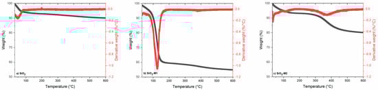 TGA of the nanoparticles (a) SiO2 pure, (b) SiO2-M1 and (c) SiO2-M2.