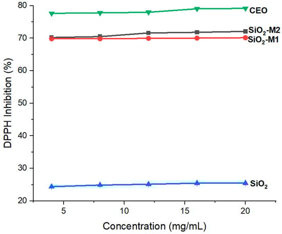 Once it was confirmed that the CEO was present in the SiO2 nanoparticles, its antioxidant power was determined in the nanoparticles modified by both methods (M1 and M2) to know which maintained a higher percentage of free radical inhibition. Figure 3 shows the results obtained for DPPH free radical inhibition. The pure CEO presents a high percentage of inhibition between 77–79%, while the SiO2-M1 and SiO2-M2 modified nanoparticles present values between 69–70% and 70–72%, respectively. These results indicate that the nanoparticles acquired the antioxidant power of CEO at 88% and 91%, respectively. In contrast, it can be observed in Figure 3 that pure SiO2 nanoparticles alone do not present a high antioxidant capacity, reaching only 24–25% inhibition. In this context, it is possible to establish that the phenolic compounds in cinnamaldehyde help inhibit the release of radicals, upon reacting with oxygen, accelerate their biological process, causing autooxidation [,]. It is worth mentioning that the percentage of inhibition was measured at different concentrations, so it is observed that the antioxidant capacity depends only on the functional groups present in the particles; This is relevant because, at a minimum concentration (4 mg/mL), the same percentage of inhibition is achieved as at a higher concentration (4 mg/mL). Studies such as that of Guo et al. [] reported a percentage inhibition of pure CEO between 88.18 and 59.35% using various cinnamon essential oil extraction methods. So far, few previous studies have evaluated CEO antioxidant power in metal oxide nanoparticles. There is only one previous work as a reference [] where an inhibition percentage of 60% was reported in TiO2 nanoparticles (size 500 nm) lower than that obtained in this study, concluding that the size of the nanoparticles used is an important factor for chemical modification with essential oils.