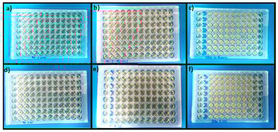 Microplates for antimicrobial evaluation for S. aureus: (a) SiO2-M2 (b) SiO2-M1 and (c) SiO2 pure; E. coli (d) SiO2-M2 (e) SiO2-M1 and (f) SiO2 pure.