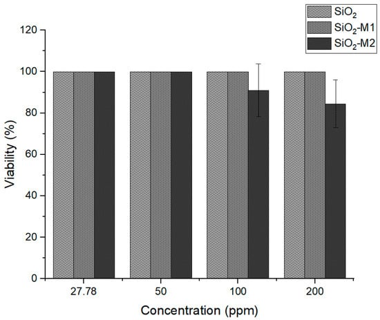 Once the antioxidant and antimicrobial activity of SiO2 nanoparticles modified with essential oil was corroborated, it was necessary to know the suitability of these nanoparticles for their application as active packaging. As they are intended for the food sector, they should not generate a health risk, so their toxicity level was quantified using the cell viability assay. The study results are shown in Figure 5 at an exposure time of 24 h; the nanoparticles treated with method one (SiO2-M1) and pure SiO2 presented 100% cell viability at different concentrations on average. In contrast, nanoparticles treated with method two (SiO2-M2) showed a decrease in cell viability with increasing concentration; however, cell viability remained above the 80% allowed, and according to ISO 10993-5:2009, the material has low toxicity. This may be because the nanoparticles have been treated with Tween 80, unlike methodology 1, so it could be assumed that it is the Tween 80 that causes this effect and not the interaction of the cinnamon essential oil. As expected, the toxicity is low, giving a guideline to develop active packaging for food applications. Similar results have been obtained by Al-Tayyar et al. [] showing low toxicity in mixtures of PVA nanocomposites with chitosan and ZnO-doped SiO2 particles.
