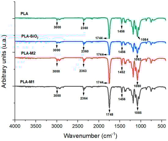 FTIR spectrum of films PLA pure, PLA-SiO2, PLA-M1, and PLA-M2.
