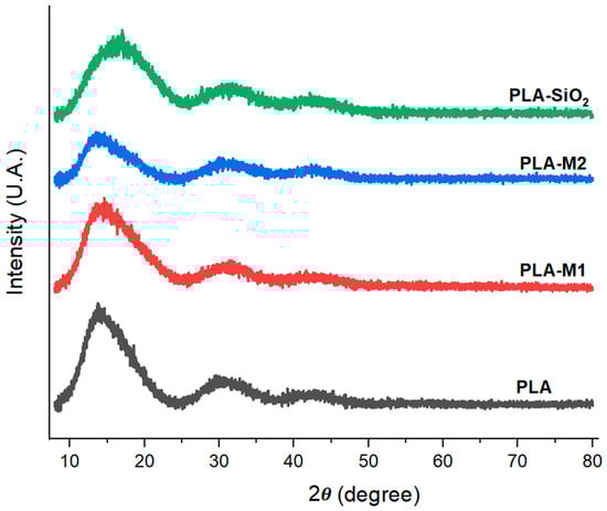 In order to know the effects of SiO2 with essential oil on the films, the diffractograms were obtained. In Figure 7, where it can be observed that all the films prepared with both pure SiO2 and modified nanoparticles presented similar characteristics. A broad peak of large protrusion with an angle of 2θ = 16.89° is attributed to the semi-crystalline nature of PLA and corresponds to the reflection of the α (110/200) crystalline shape plane []. The film formulated with the M1 method showed a slight variation, which can be quantified by calculating the percentage of crystallinity, which was 52.56. At the same time, the pure PLA had a value of 55.01%.