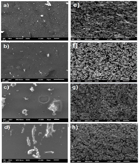 XRD diffraction spectrograms were obtained using an X-ray diffractometer (D8 ADVANCE, Bruker) using a Cu Kα radiation beam filtered with nickel, with an angular range of 8–80° at a step of 2θ and voltage of 40 kV. Samples were cut into small frames of 1 × 1 cm. The prepared films were analyzed with a Philips/FEI XL30-SFEG high-resolution microscope. A 2 × 2 cm sample was cut out, placed on pins, and coated with a thin layer of silver from the central part of the films. The inspection was made on the surface of each film at an accelerating voltage of 20 kV.