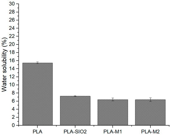 Water solubility can be described as the solubilized dry matter content after 24 h immersion in water. The method for determining water solubility is described as follows: in a laboratory oven, the samples were dried for 24 h at 50 °C until constant weight and then weighed (W1). The samples were then immersed in 40 mL of distilled water for 24 h at room temperature under magnetic stirring. After this time, the film was removed and dried at 110 °C for 24 h until constant weight and was weighed to determine the weight of the final matter (W2) that had not dissolved in water []. Formula (5) was used to determine the percentage solubility in water.