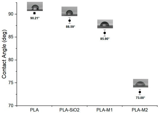 In order to evaluate the modifications in the structure of the PLA polymeric matrix, infrared spectroscopy analysis was performed. Figure 6 illustrates the FTIR spectrum for PLA films and films reinforced with pure SiO2 particles and those modified with the M1 and M2 methods. Absorption signals can be observed at wavelengths of 867 cm−1 and 754 cm−1, corresponding to the PLA amorphous phase and crystalline phase, respectively []. Bands also appeared at 1183 and 1081 cm−1, which are attributed to the symmetric and asymmetric stretching of the ether group (C-O-C) []. The bands appearing at 1453 and 1358 cm−1 correspond to saturated hydrocarbons’ asymmetric and symmetric stretching vibration (CH3-) []. The band at 1744 cm−1 is attributed to the stretching vibration (C=O) of the ester group of PLA molecules []. The peaks observed at 2933 cm−1 correspond to the CH3- stretching vibrations, and the bands observed at 1628 and 1506 cm−1 are assigned to the carbonyl and ethylene groups, respectively []. In the film samples, no significant changes were observed in the spectra obtained; only slight changes in peak intensities were observed. This indicates that no noticeable changes occurred in the chemical structure of PLA since no new chemical bonds were formed between PLA and pure and modified SiO2 particles. These results were also observed by Lukic et al. [] and Mohamad et al. [] on PLA films with essential oils in the polymer matrix, showing that there are no significant chemical changes in the films after the addition of active agents.