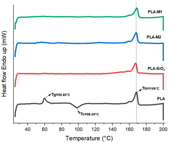 Nowadays, thanks to their properties, essential oils can constitute an alternative to synthetic preservatives and are considered the antibiotics of the future, so we can find in literature several studies of PLA films with essential oils; clove essential oil [], Oregano essential oil [], carvacrol and thymol essential oil [], bergamot, lemongrass, clove and rosemary essential oils [], cinnamon essential oil [], Green tea [] and thyme, rosemary, and oregano essential oils []. However, a disadvantage of this semi-crystalline polymer is that its crystallization kinetics is very slow because of the low nucleation capacity. Therefore, this limits its applications since its mechanical properties depend on the degree of crystallinity. Generally, PLA has a crystallization rate in the range of 10 to 20 °C/min at temperatures below 100 °C and a crystallinity of less than 10% due to this poor crystallization ability [,]; this is why some material is needed to reinforce and thus improve its crystallinity in order to maintain or even improve its properties.