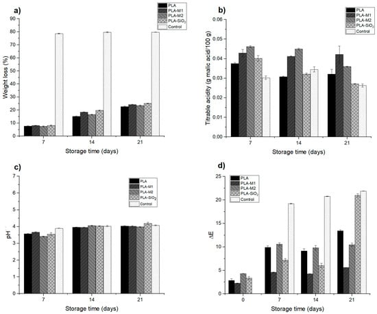 One of the most promising options is the use of biodegradable polymers for active packagings, such as polysaccharides, cellulose, chitosan, polypeptides, gelatin, zein, polyhydroxyalkanoates, soy protein isolates, and polylactic acid. For the past 30 years, there has been a gradual growth in research focused on the development of active films based on biodegradable polymers []. Polylactic acid (PLA) has been used in the development of active films because it is approved by the Food and Drug Administration (FDA) as a safe material (GRAS) for food and beverage packaging []. In addition, it has high mechanical properties, tensile strength (45–65 MPa), and particularly Young’s modulus (5–10 GPa), indicating that it is a good substitute for basic polymers such as polypropylene (PP), polyethylene (PL) and polystyrene (PS) in short-life packaging [,].