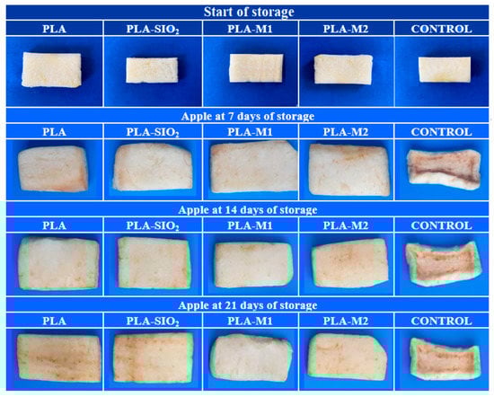 Golden Delicious apples from Saltillo Coahuila were obtained from a local grocery store. The apples used during the storage test were 2 × 3 cm in size per piece. These apples were packed with properly processed and heat-sealed film. The storage time of the apples was 21 days at 15 °C; in addition, complementary tests of color, pH, acidity, and weight loss were performed weekly to evaluate the behavior of the fruit stored and packed with this active package.