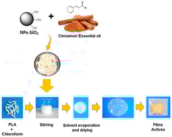 Considering the above, the present work aims to chemically modify SiO2 nanoparticles with cinnamon essential oil (CEO) to improve the antioxidant and antimicrobial properties of these nanoparticles and can function as a nanofiller to confer these properties to the PLA polymeric matrix. The above with the aim of generating an active component in the preparation of films suitable for food preservation. The casting method was used for the preparation of films as active packaging. The effects on the mechanical, thermal, barrier, physical, and microbiological properties of the films were evaluated, and their effectiveness as active packaging was tested by storing a fruit (apple) for a short period of 21 days.