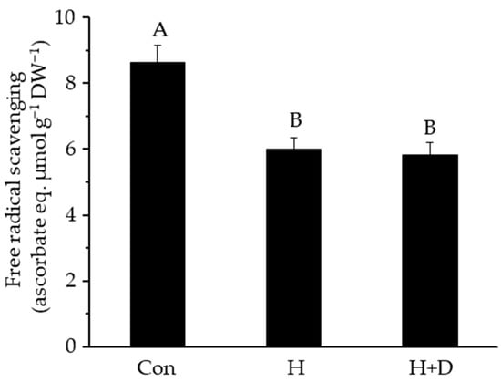 To assess the free radical scavenging activity of the leaves, the DPPH test was used, which has been described as an indicator of total LMW antioxidant activity []. Leaf extracts of H and H+D plants quenched the DPPH radical by ca. 30% less than leaf extracts from control plants (Figure 2), indicating that the heat-hardening process led to a loss of LMW antioxidants able to scavenge radicals.