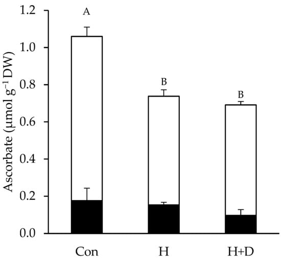 Leaf concentrations of reduced ascorbate and dehydroascorbate without heat hardening were 0.88 and 0.18 µmol g−1 DW, respectively. In H and H+D leaves, concentrations of reduced ascorbate significantly dropped to <0.6 µmol g−1 DW, while dehydroascorbate concentrations were insignificantly different (Figure 3).